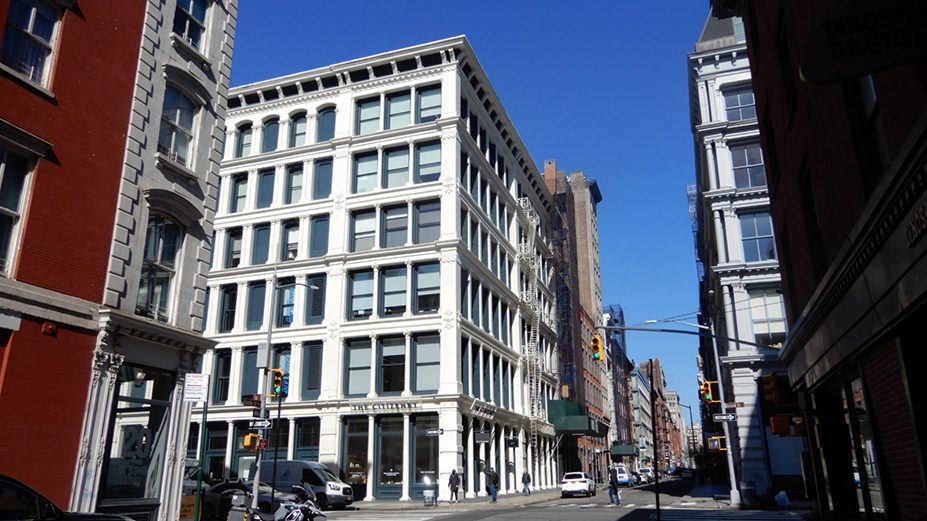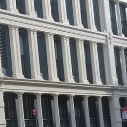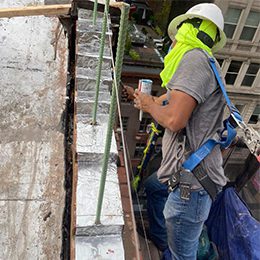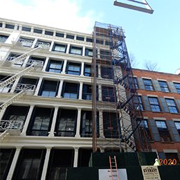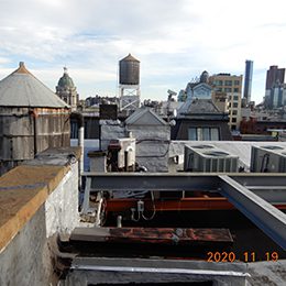 This six-story commercial structure in the SoHo-Cast Iron Historic District was originally the Mills & Gibb building designed by John Correja and built in 1880. SUPERSTRUCTURES provided investigation, design, and construction administration services to restore the building’s north facade. Restoration work included: localized brick masonry repairs; repointing the north wall brick parapet; and removal and replacement of existing bluestone parapet coping with new cast stone matching the size and color of the original units. The project also included resetting the loose protection wire- screen frame over the bulkhead skylight, installation of fluid-applied flashing at the roof perimeter, and removal of abandoned masonry anchorage.