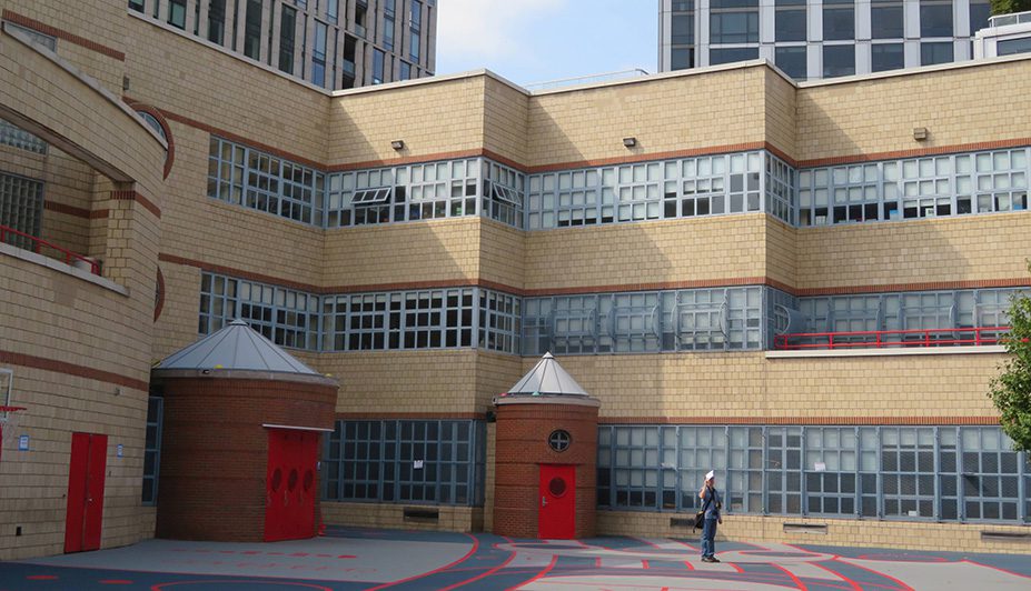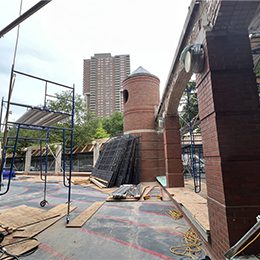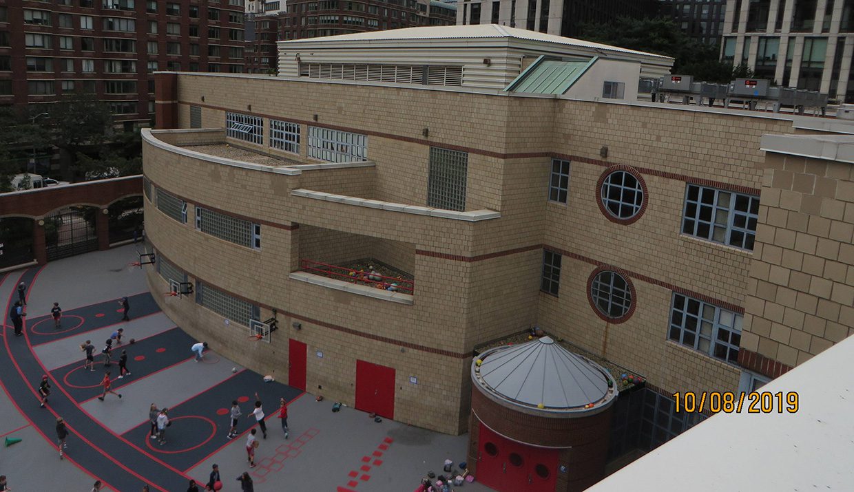 Known as the Independence School, this K-5 facility in Tribeca was built in 1988. Responding to an investigation of cracks in the building’s facade due to structural deficiencies, SUPERSTRUCTURES provided investigation and design services to remediate the issues. Restoration of the facade included: brick corner reconstruction; replacement of deteriorated face brick; masonry expansion joint restoration; brick arch restoration; brick pier reconstruction; brick and steel lintel replacement; repointing of open masonry joints; and stone crack and spall repairs. Roof work included replacement of the roofing membrane at the one-story setback; replacement of turret sheet metal roofs, and roof drain flashing and drain dome replacement. A conservation treatment plan for artwork at the school was also developed in coordination with Public Art for Public Schools.