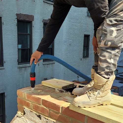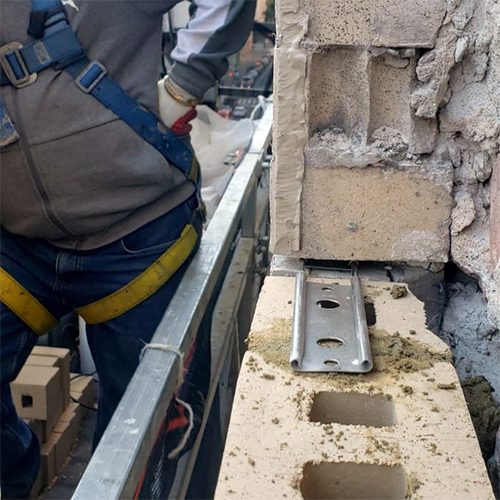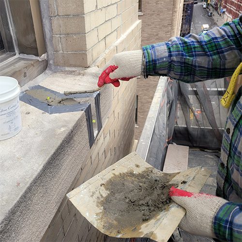 The project includes brick corner reconstruction and repointing, cracked and spalled masonry unit replacement, spandrel restoration, metal coping replacement, steel lintel restoration, and joint sealant replacement.