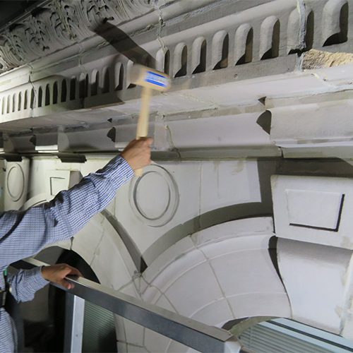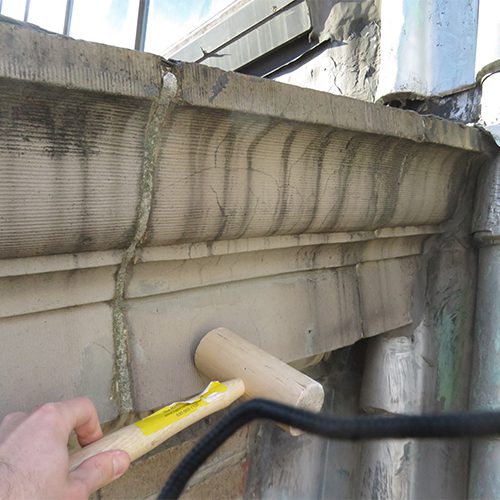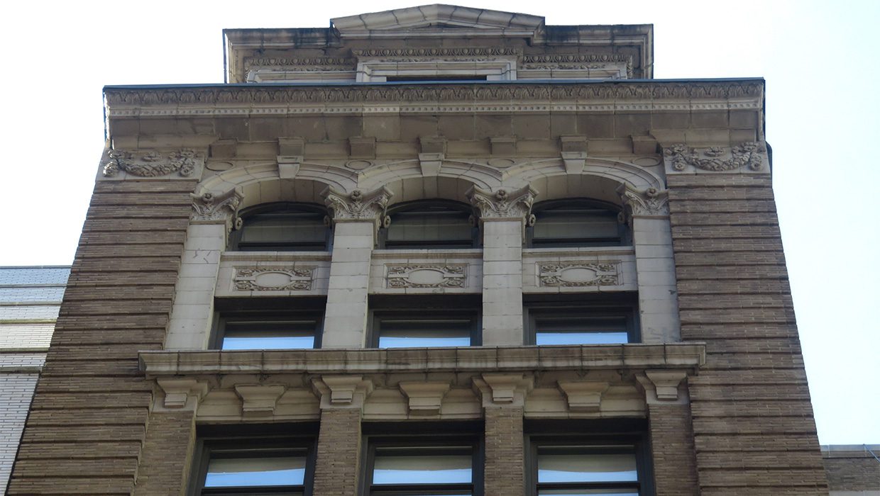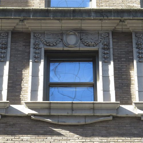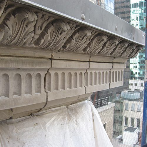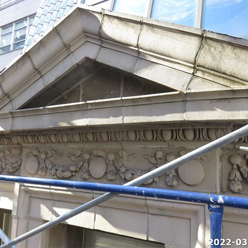 Restoration work included: replacement of cracked masonry units; removal of existing windows with lintels and installation of brick masonry infill; brick masonry corner replacement; replacement of existing steel lintels; scraping and painting of existing steel shelf angles and spandrel beams, including replacement of brick masonry; replacement of terra cotta units with cast stone and GFRC; and restoration of cracked and spalled terra cotta units.