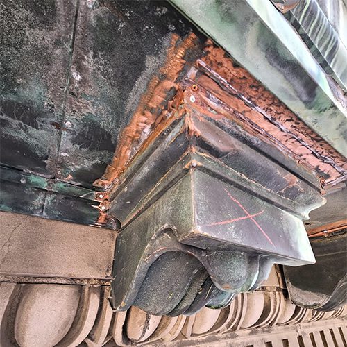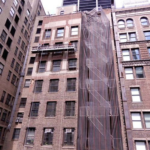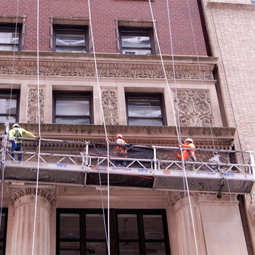 Restoration work included: copper cornice restoration; replacement of cracked masonry units; masonry and stone re-pointing; stone crack repair; fire escape member repairs; terra cotta patching; and terra cotta coating repairs.