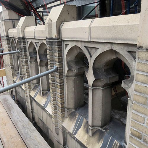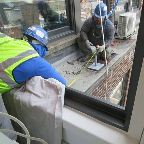 The project included repair or replacement of cracked terra cotta and masonry units, overhead concrete slab repairs, mortar joint repointing, railing repairs, and joint sealant replacement.