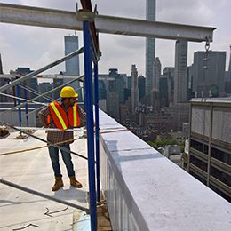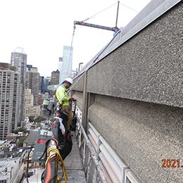 SUPERSTRUCTURES conducted a FISP Cycle 8C critical examination of this steel-framed, 19-story educational tower built in 1976. A restoration plan followed to address deficiencies in the facade. Restoration work included: repair of spalled and cracked precast concrete panels; coating of exposed and rusted rebar; replacement of spalled or missing brick masonry units; replacement of all joint sealants at precast concrete panels and below copings; and replacement of deteriorated or missing building expansion joints. The project also included: replacement of deteriorated or missing window perimeter and glazing sealant; installation of new main roof railing system; repair and replacement of loose, damaged, and missing metal panels; installation of through-wall flashing above windows and below copings; and suspended metal panel ceiling replacement.