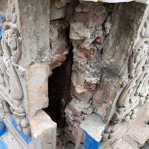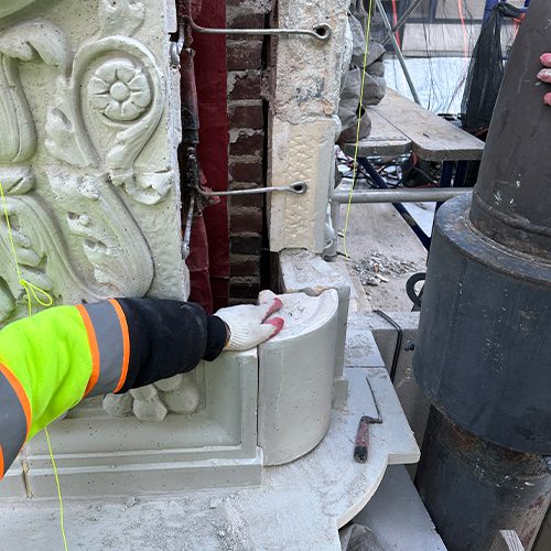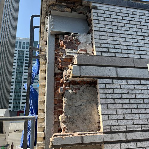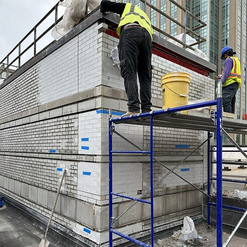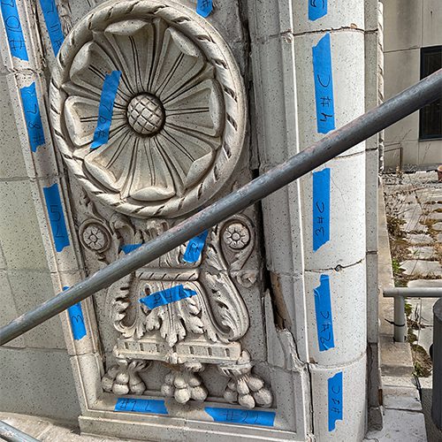 SUPERSTRUCTURES was retained by DASNY to conduct an envelope investigation and restoration campaign to address defects on NYC College of Technology’s “G” building in downtown Brooklyn. The firm performed a close-up inspection via boom lift with a sounding hammer to evaluate defects in the building’s brick masonry, limestone, and terra cotta. The restoration scope included a range of repairs to make the building envelope safe and watertight: masonry replacement, pinning, and repointing; lintel replacement; limestone and terra cotta corner reconstruction; steel coating; and expansion joint sealant replacement.