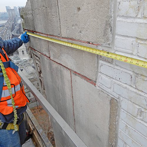 SUPERSTRUCTURES’ solution: an investigation which catalogued every defect and a restoration plan to make the facade shine again. Restoration work included: masonry recoating; concrete spall repair; coping replacement and sky joint sealant replacement; brick masonry veneer reconstruction; brick masonry and stone repointing; terra cotta crack and spall repair; and raised terra cotta joint repair. The project also included: limestone and marble crack and spall repairs; stone unit re-anchoring; and decorative sheet metal repair and replacement.