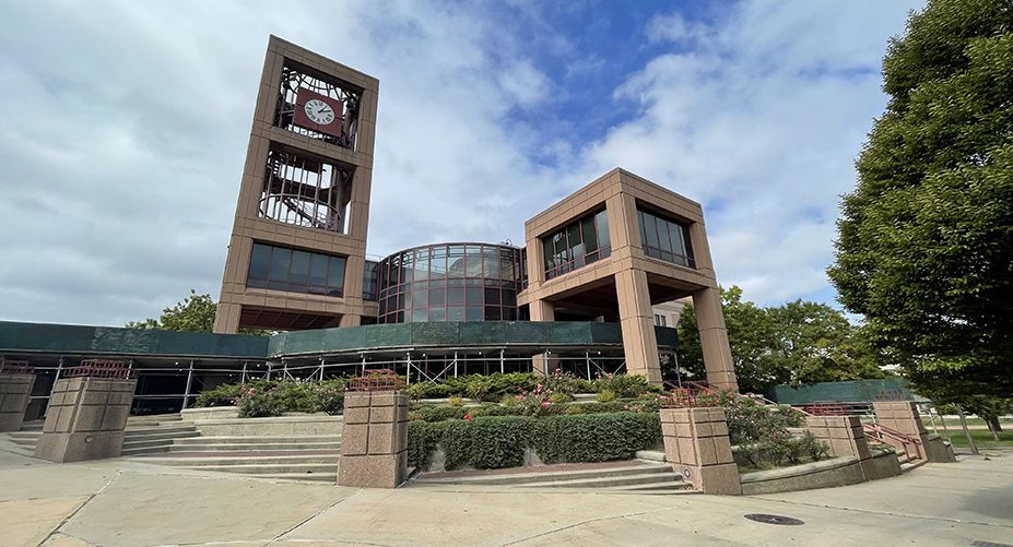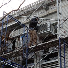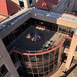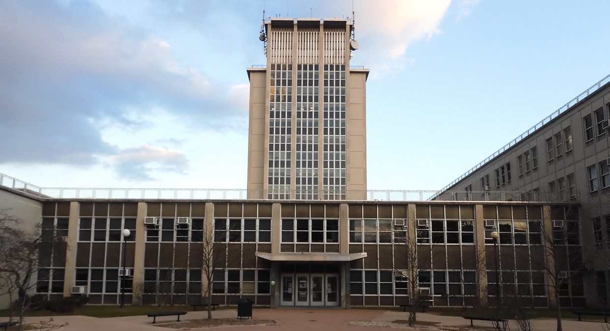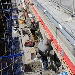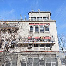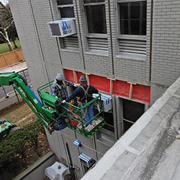 SUPERSTRUCTURES conducted FISP emergency repairs for Queens College’s Kiely Hall (Moore and Hutchins, 1967), an academic complex comprising a two-story base building with a 13-story central tower, and for the Benjamin S. Rosenthal Library (1988). Restoration work included: brick masonry spall and crack repair; pinning of shifted brick masonry and stone panels; repointing of brick masonry and stone panel joints; stone panel and soffit replacement; and concrete spall repair. The project also included metal railing recoating, window glazing replacement, and metal curtain wall panel replacement.