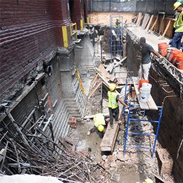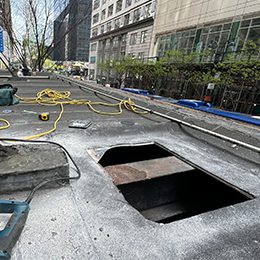 SUPERSTRUCTURES provided investigation, design, and construction administration services to restore the sidewalk vaults of the Manhattan Center. The project scope included: replacement of existing monolithic sidewalk concrete reinforced slab over vaulted space below; replacement of existing steel-faced concrete curb and drop curb at loading dock with new NYC DOT standard steel-faced concrete curb assemblies; installation of new steel framing for new vault roof slab and flashing; installation of new reinforced concrete slab on galvanized composite metal deck for the vault roof slab; and replacement of concrete encased steel beam under the sidewalk and curb and over the vault wall. Work also included partial removal of street pavement along the curb, excavation, and backfill; and installation of new waterproofing membrane between sidewalk topping slab and new vault roof slab and flashing.