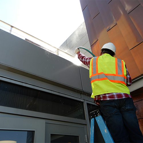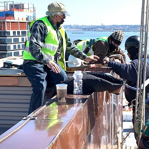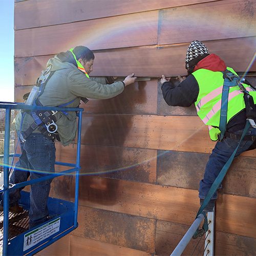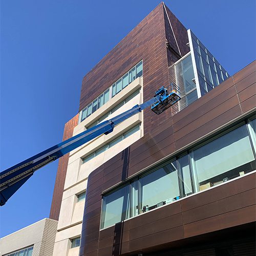Restoration work included: replacement of cracked masonry units; removal of existing windows with lintels and installation of brick masonry infill; brick masonry corner replacement; replacement of existing steel lintels; scraping and painting of existing steel shelf angles and spandrel beams, including replacement of brick masonry; replacement of terra cotta units with cast stone and GFRC; and restoration of cracked and spalled terra cotta units.