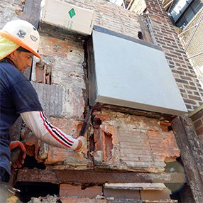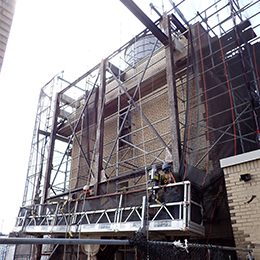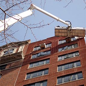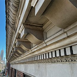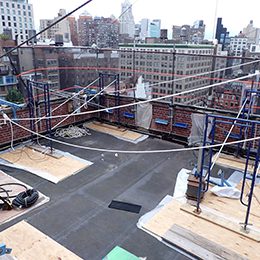 SUPERSTRUCTURES provided investigation, design, and construction administration services to restore the facade and roof of NYU’s Rubin Residence Hall at 35 Fifth Avenue. The restoration scope included: removal and replacement of the roofing system at the penthouse terrace and annex roof; application of a protective coating system over the existing penthouse roof; door replacement; drain replacement; infill of slab opening with cast-in-place concrete; parapet reconstruction; stucco repairs; repair of existing steel railings; and structural steel repairs.