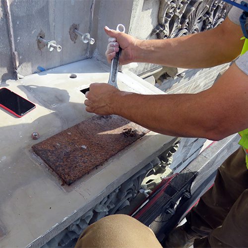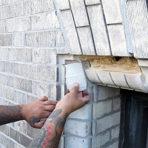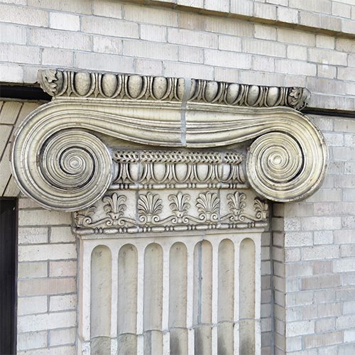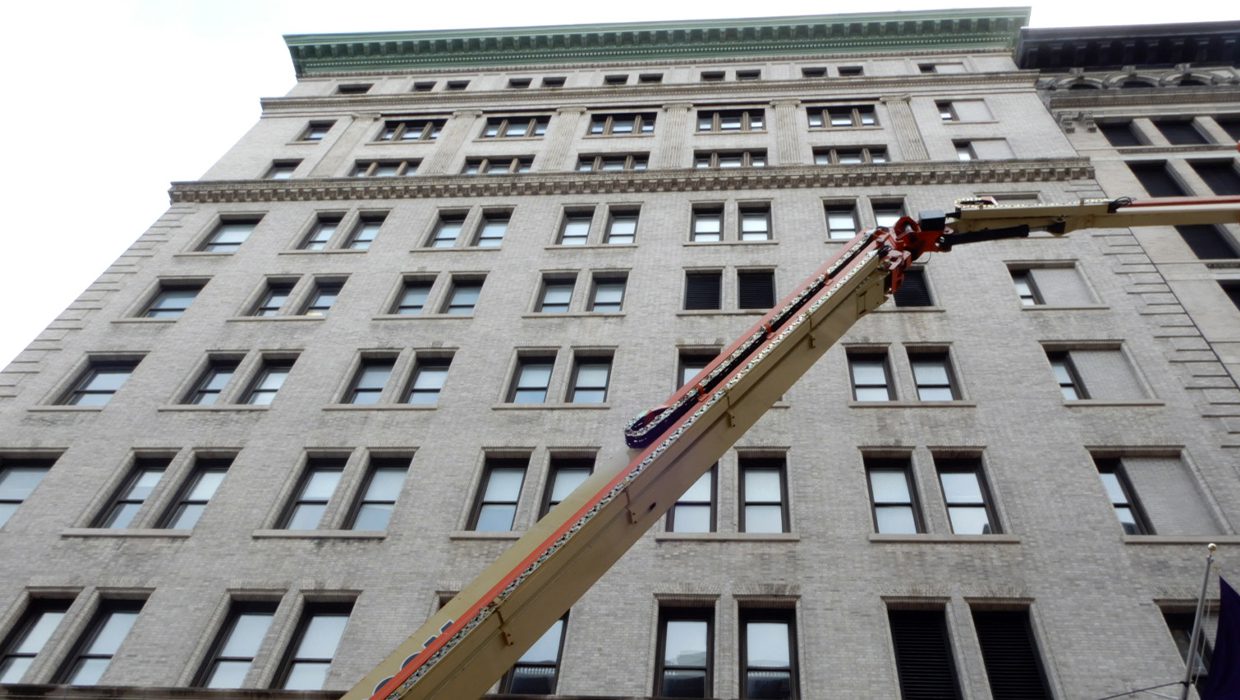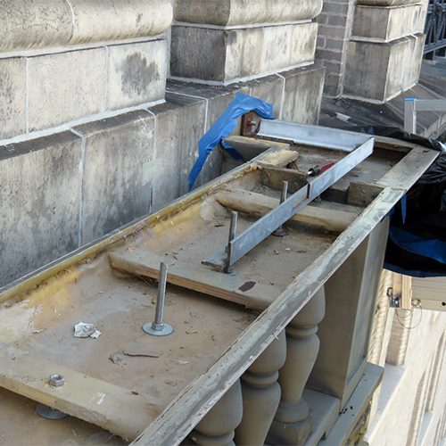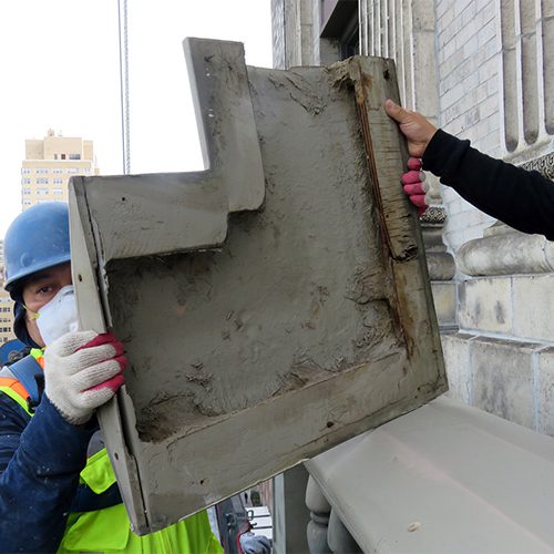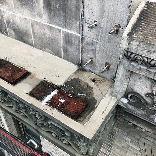 Restoration work included: restoration of cracked and spalled terra cotta, stone, and brick masonry; balcony repairs; loose railing restoration; and stone masonry joint repointing. The project also included deteriorated door sill restoration, plaster parging on brick masonry, metal coping restoration, and restoration of parapet expansion joints.
