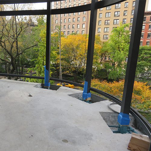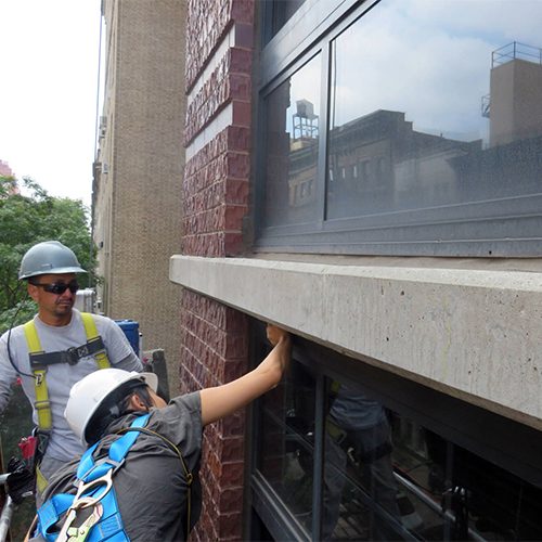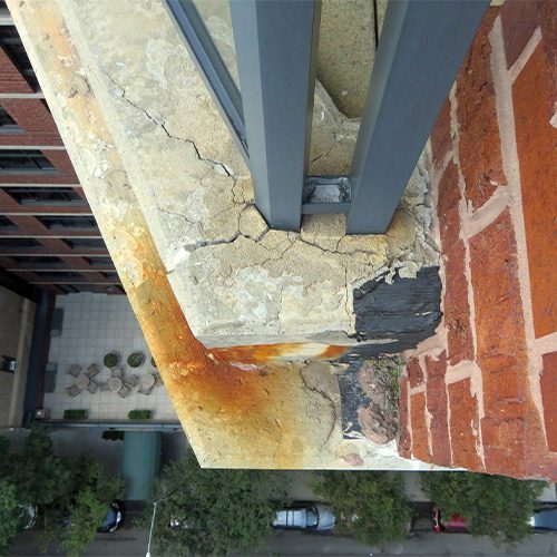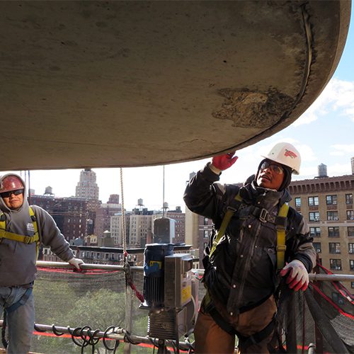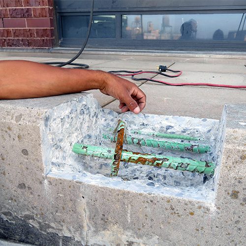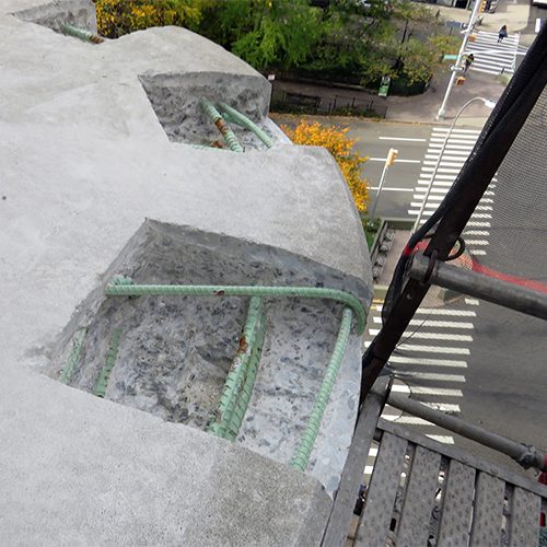 Restoration work included concrete crack and spall repairs at building eyebrows, repair of cantilevered balcony and terrace railing posts, rebar repairs, and concrete coating.
