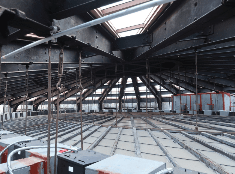 Another case of exclusive access came through our work on the rotunda of the Tweed Courthouse, also a NYC landmark. The space between the rotunda’s colorful, stained-glass laylight and the utilitarian, steel-and-glass skylight above affords a look at the elegant structural system (a modern addition inserted during an earlier restoration) which allows light to flood the interior.