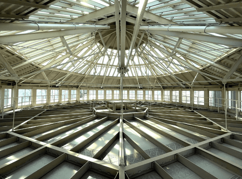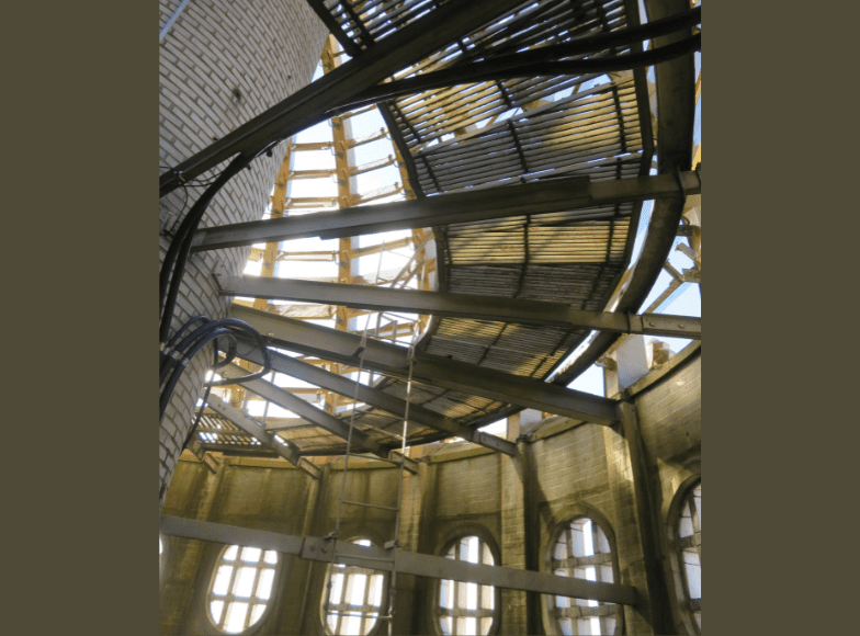One example is One Hanson Place, a Brooklyn landmark with a distinctive clock tower. In the course of investigating the structure’s condition, our team got to examine the open dome structure that caps the tower. Originally, the dome was illuminated at night by multicolored lights. To accommodate the lighting system, it was clad with operable louvers.