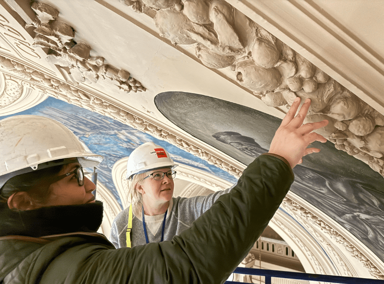 SUPERSTRUCTURES’ Associate Principal, Lorie Riddle, RA (center) and Architectural Conservator, Nityaa Iyer (left) examine the condition of ornamental plaster on the rotunda ceiling of the Alexander Hamilton U.S. Custom House—from a platform 40 feet above the floor.
