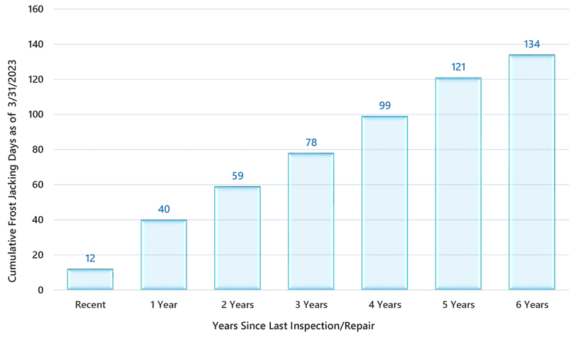 The "last inspection/repair" might be the critical examination date for a building subject to FISP requirements, or the date of completion of a facade repair campaign. If this occurred between October and April, the number of frost jacking days may decrease. The cumulative number of frost jacking days isn't a precise indicator of facade behavior: there are other variables, such as age, condition, orientation, materials of construction, etc. But it may help you understand why your building may be experiencing new problems and why it needs to be periodically inspected.