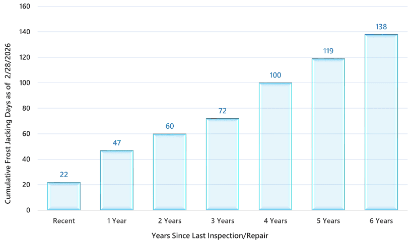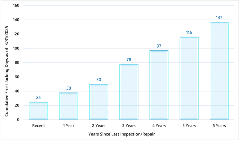 The "last inspection/repair" might be the critical examination date for a building subject to FISP requirements, or the date of completion of a facade repair campaign. If this occurred between October and April, the number of frost jacking days may decrease. The cumulative number of frost jacking days isn't a precise indicator of facade behavior: there are other variables, such as age, condition, orientation, materials of construction, etc. But it may help you understand why your building may be experiencing new problems and why it needs to be periodically inspected.