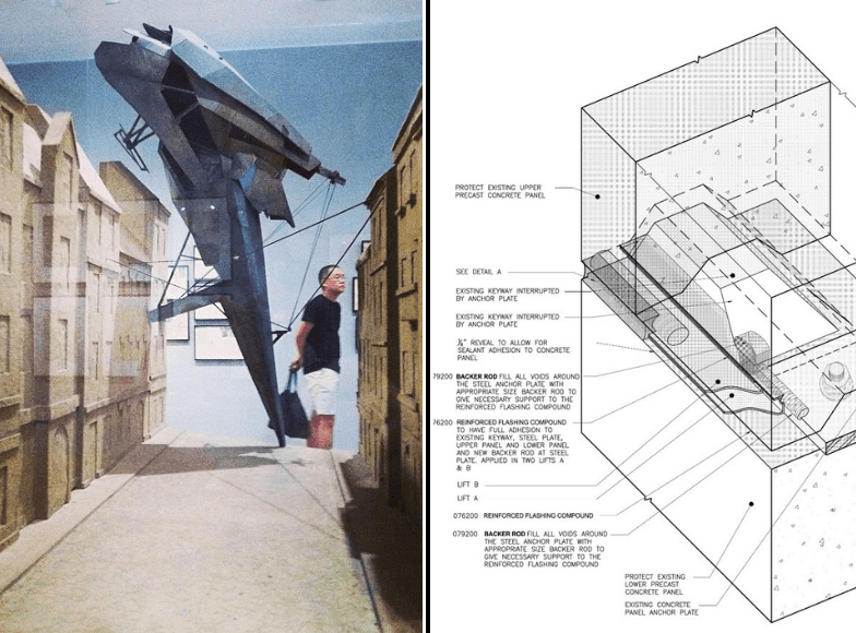 L: Model of a Lebbeus Woods design. R: A detailed SUPERSTRUCTURES restoration assembly drawing.