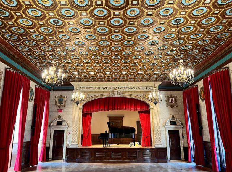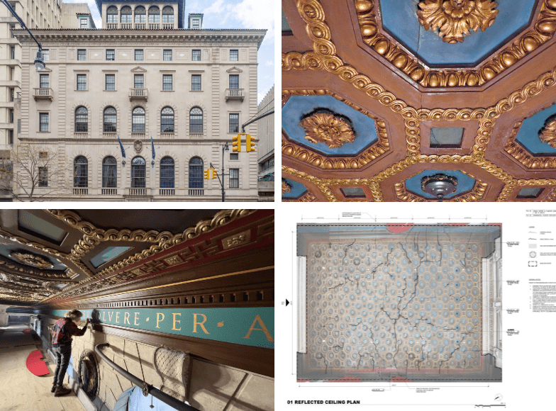 SUPERSTRUCTURES investigated the ceiling of the building’s second floor Teatro (theater). The coffered, gilded plaster ceiling had been subjected to water infiltration from HVAC equipment above, causing cracks, displacement, losses, and staining. We developed a restoration design and provided construction administration services to restore it.