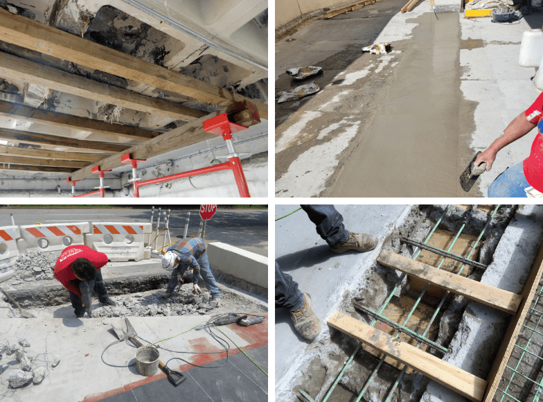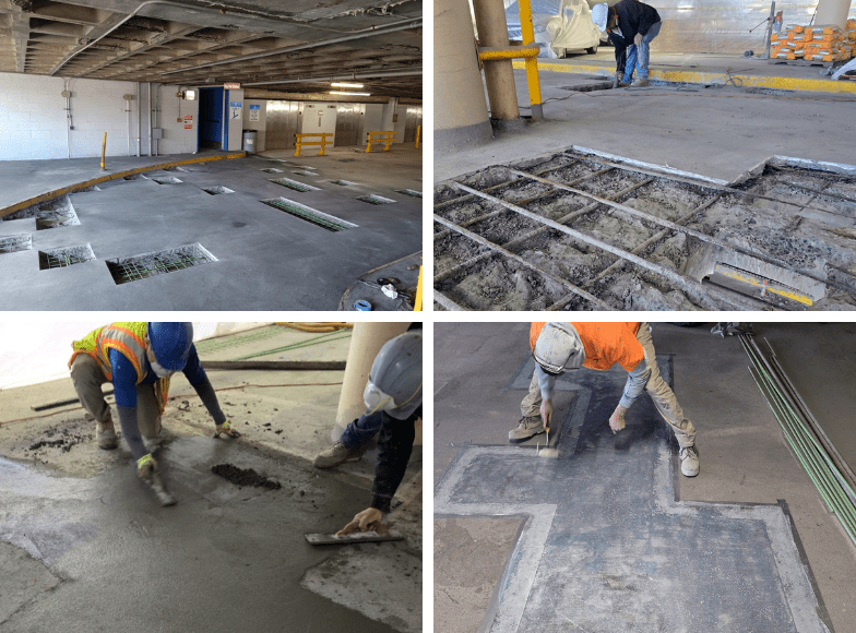 Restoration work includes “classic” concrete waffle slab repair, concrete patch repair, expansion joint and steel curb replacement, concrete slab coating, and slab-on-grade repair.