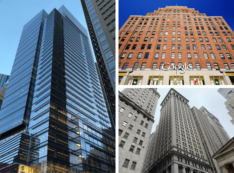 Left: 11 Times Square. Top Right: Google’s Port Authority building. Bottom Right: 14 Wall Street