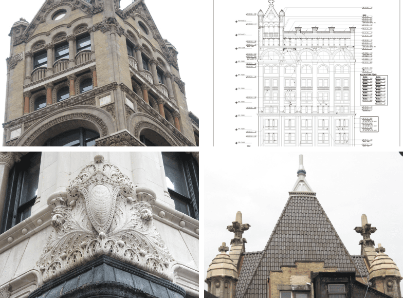 Designed as an office building in a unique rendition of the Romanesque Revival style, it became a residential co-op. The AIA's Guide to New York City characterized its style as "Unspeakable eclectic: a murmuration of Byzantine columns, Romanesque arches, Gothic finials and crockets . . . the whole arsenal of history in one shot." Its facade features a rich palette of masonry, with windows framed in cast iron and wood, and a clay tile and copper roof. So, it’s no wonder that SUPERSTRUCTURES’ restoration of the building’s facade and roof presented multiple challenges.