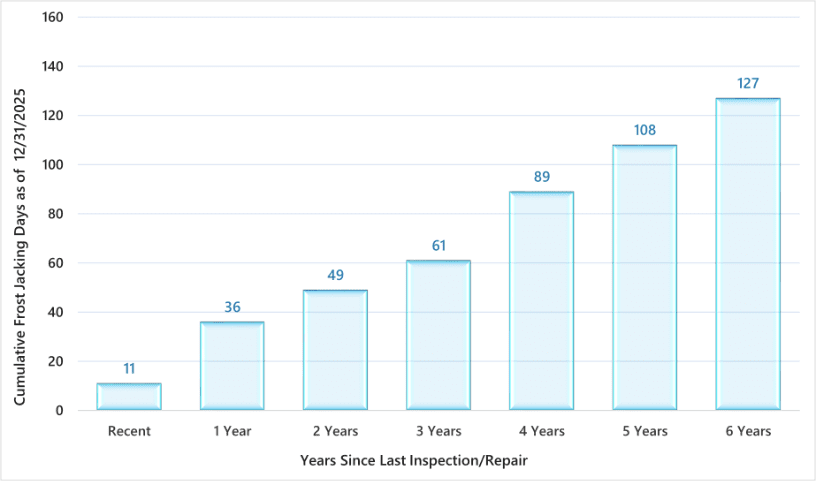 But continuous cold spells aren’t solely responsible for this phenomenon. Frost jacking is driven by ongoing cycles of freezing and thawing, causing masonry cracks to grow with each cycle, increasing potential for hazardous conditions to develop.